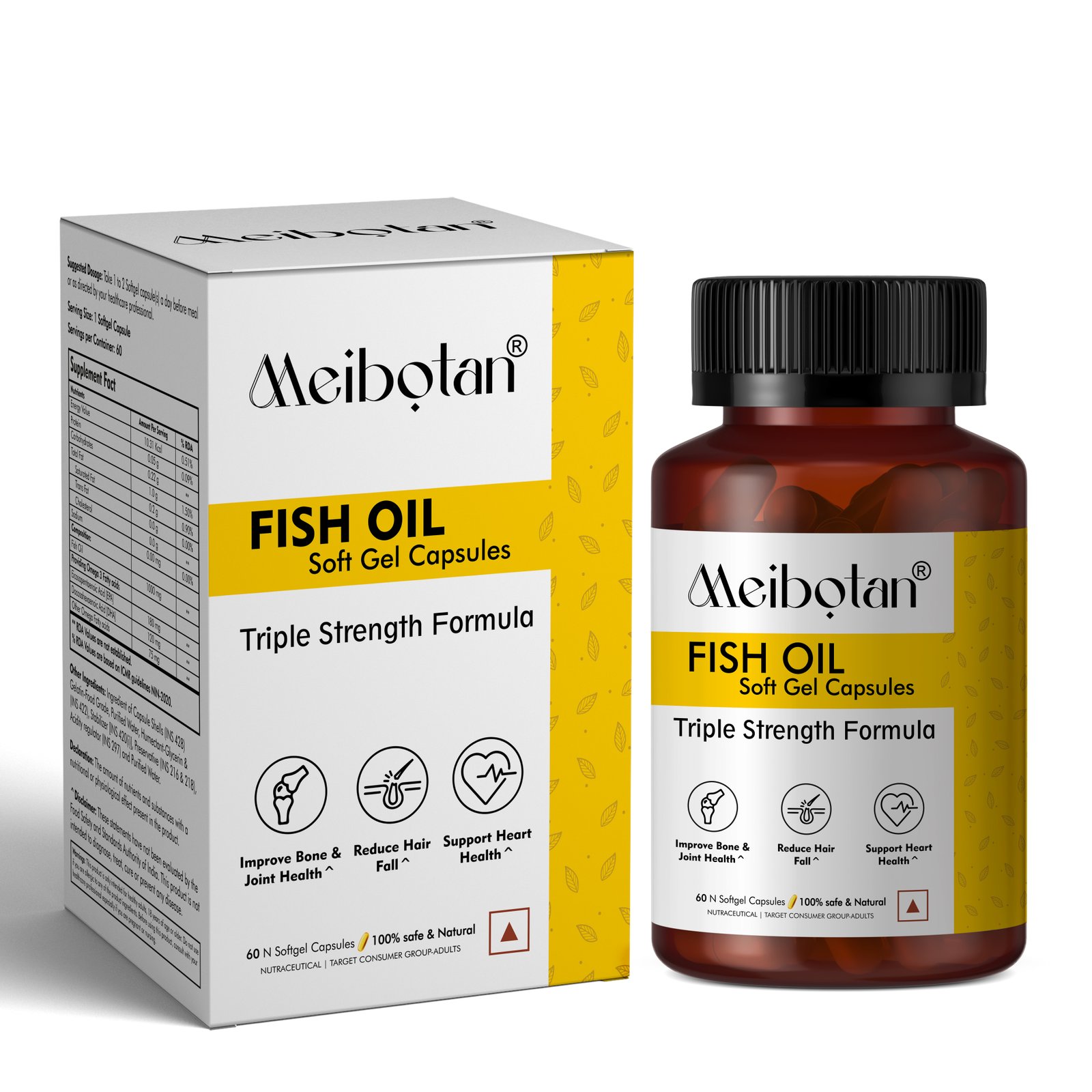 MEIBOTAN Omega 3 Fish Oil 1300mg Triple 3X Strength - 550 mg EPA & 350 mg DHA for Heart, Joints & Brain Health - 60 Capsules